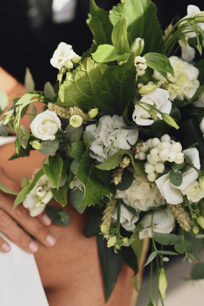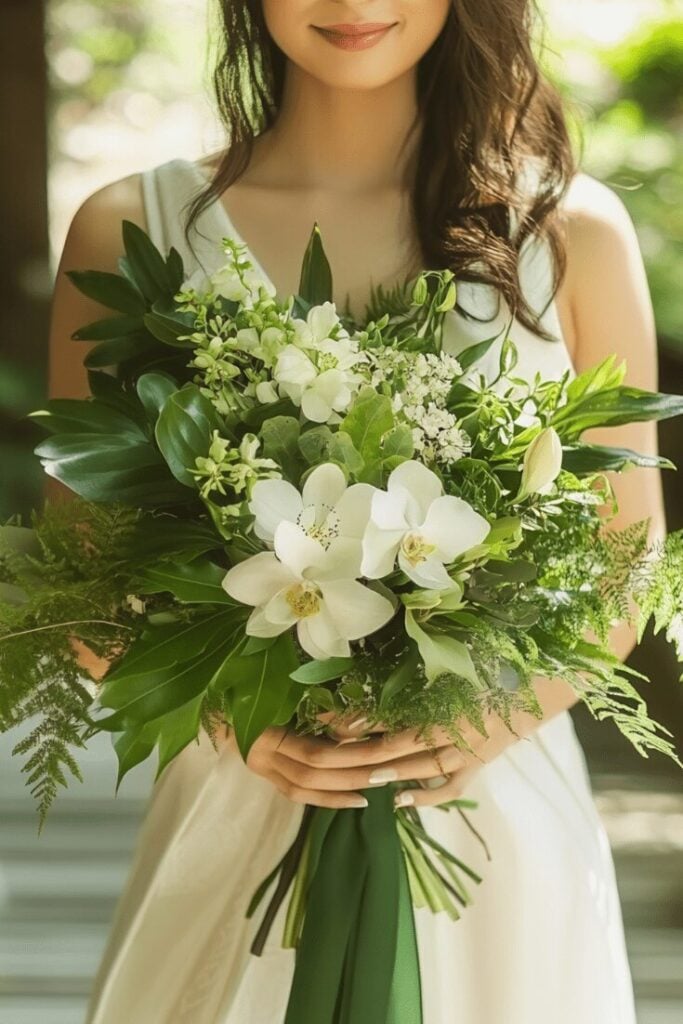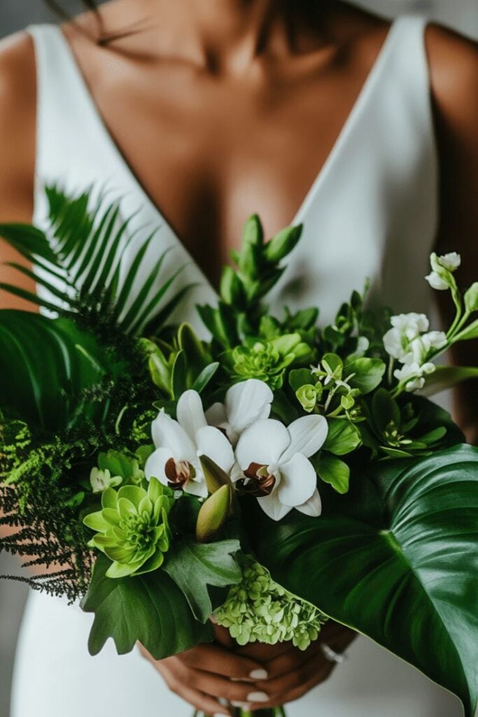 This striking wedding bouquet is all about bold texture and rich emerald hues. Sleek monstera leaves and tropical greens combine with crisp white blooms for a fresh, contemporary feel. It’s perfect for a minimalist bride with a modern edge.